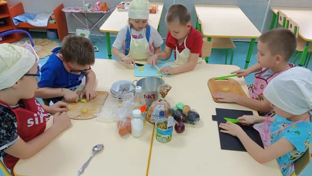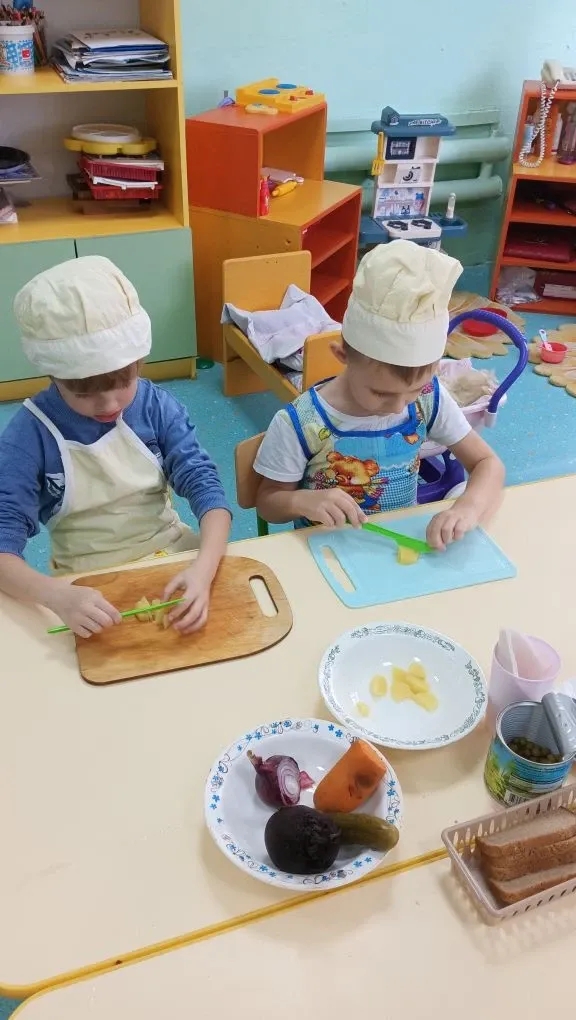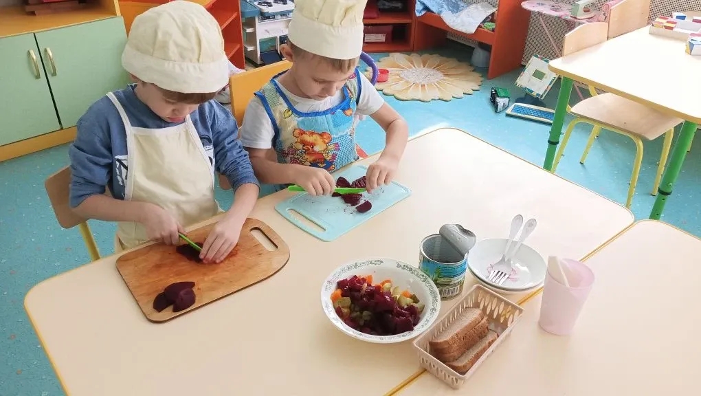 Воспитанники группы компенсирующей направленности "Звездочка" побывали на кулинарном мастер-классе «Кто такие витамины и где они живут» по приготовлению винегрета. Салаты - очень полезная еда. Они диетические и содержат мало калорий, стимулируют аппетит. Ребятам напомнили, что все продукты проходят разные виды обработки (сортировка, мытье, очистка, нарезка), повторили меры безопасности при работе с ножом, как правильно держать нож и резать овощи. Перед приготовлением дети тщательно вымыли руки, оделись как настоящие повара - в поварские колпаки и фартуки. Дети резали под контролем воспитателя. В процессе приготовления салата ребята узнали о полезных свойствах овощей. Юные поварята с большим интересом участвовали в приготовлении салата, для многих это был первый опыт приготовления еды. Дети с большим нетерпением ждали, когда же приготовится салат и его можно будет попробовать. И вот, соединив все ингредиенты, можно приступать к дегустации.